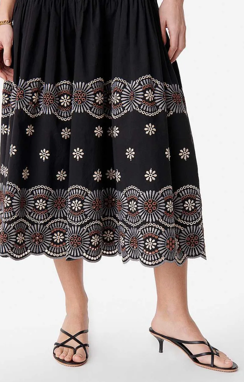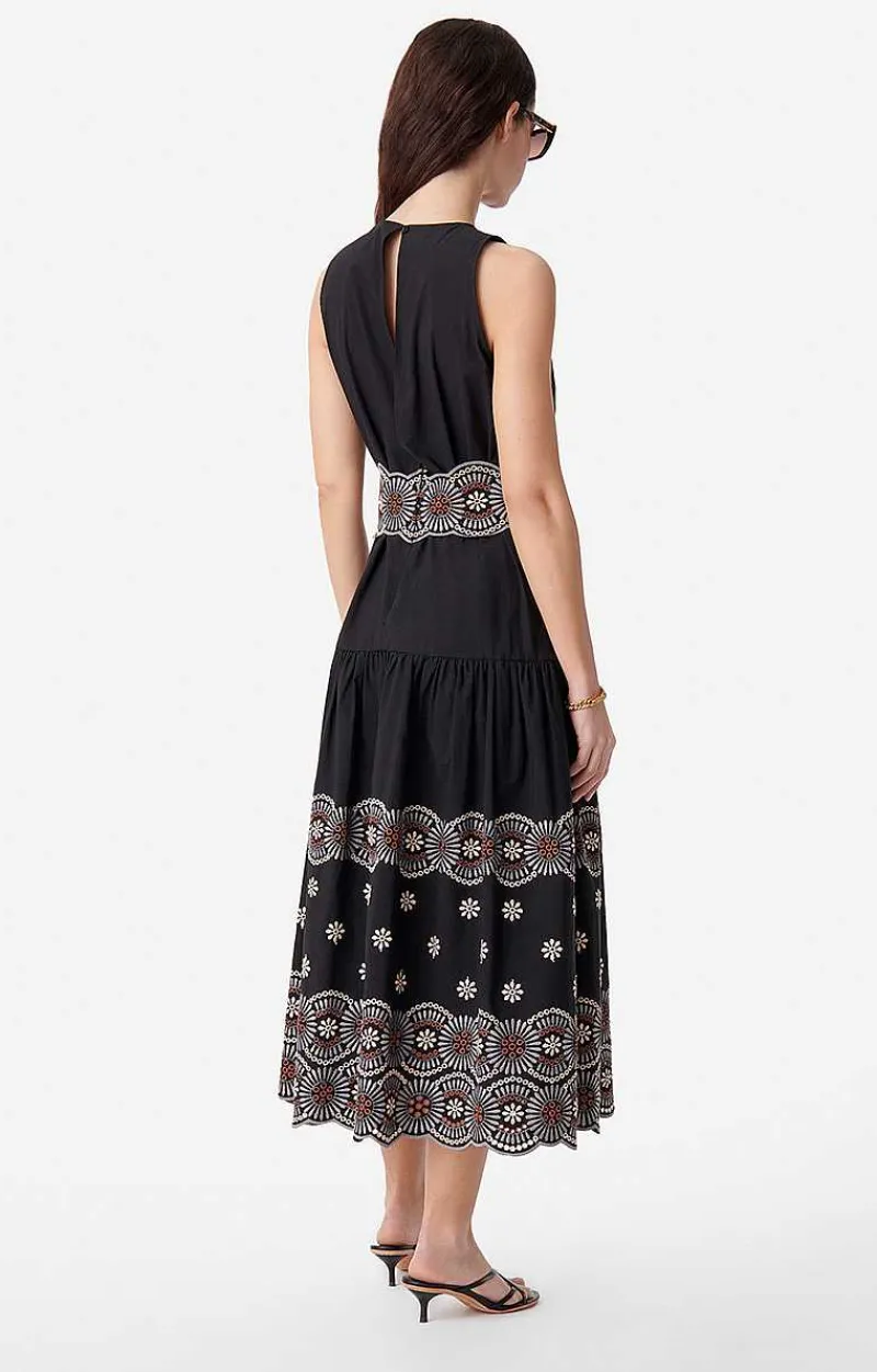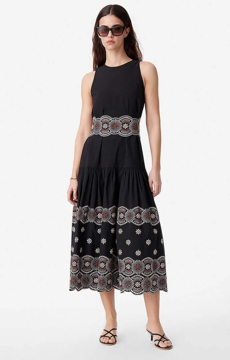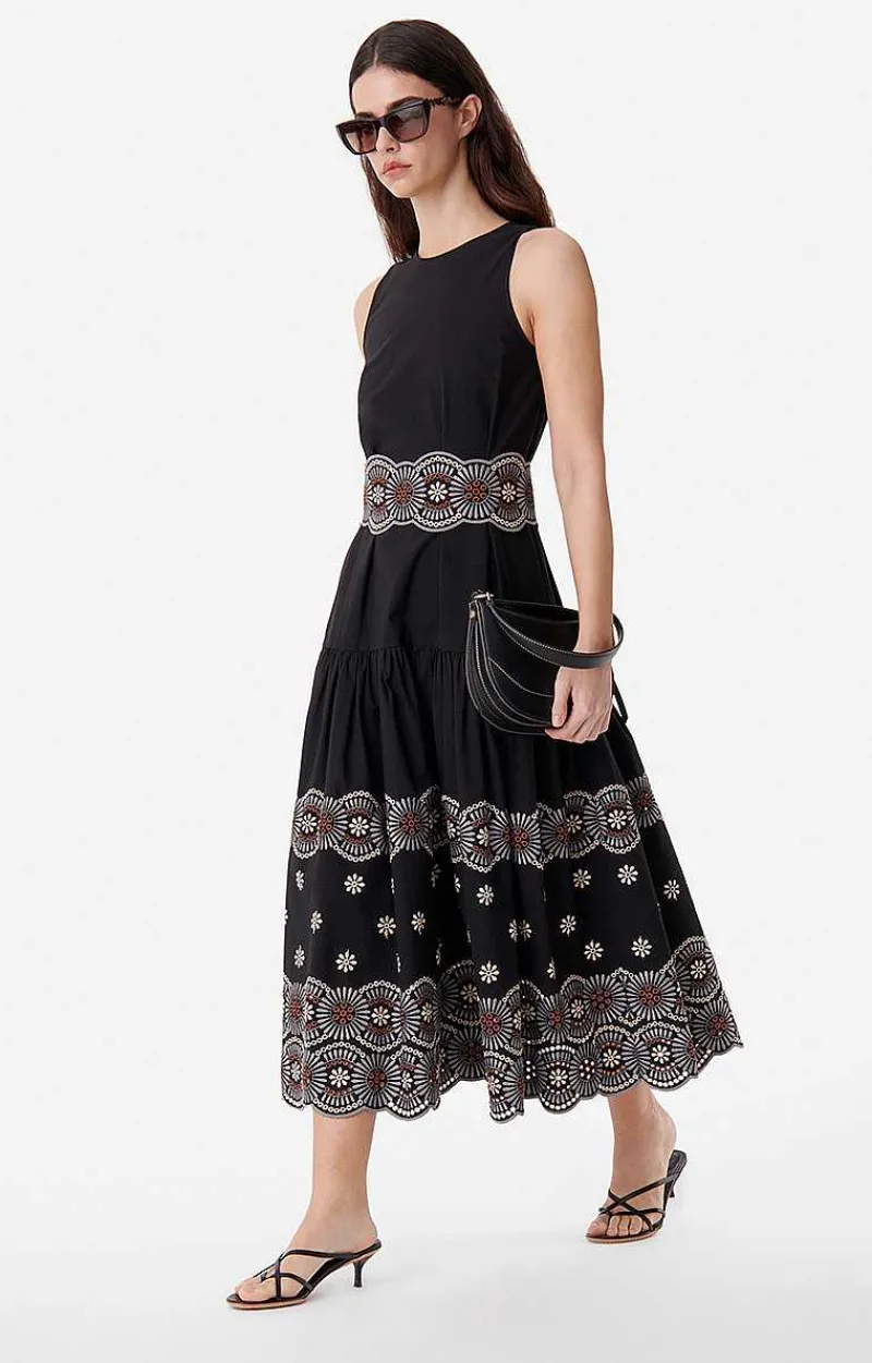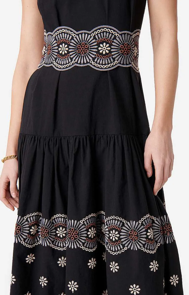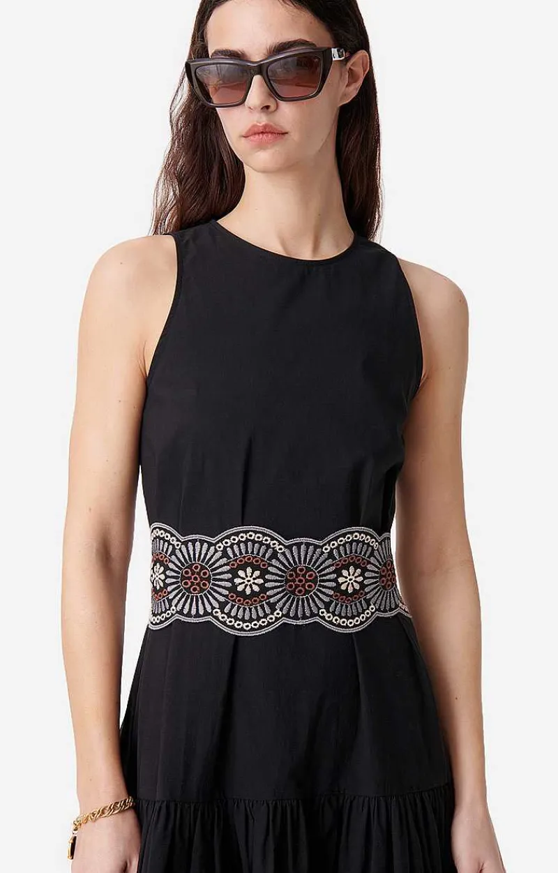 The Alais Dress Is Distinguished By Its Tricolour Broderie Anglaise Technique Which Creates A Very Hypnotic Ornamental And Graphic Pattern, Giving It Much Originality. Its Cut Is Like That Of A Loose Slip Dress, With A Large Flounce At The Bottom That Contrasts With The Integrated Waistband, Stitched In The Back, Which Nicely Tightens The Waist And Gathers The Volume On The Body. We Love The Large Slit In The Back, Down To The Waist. A Very Feminine And Sensual Detail.